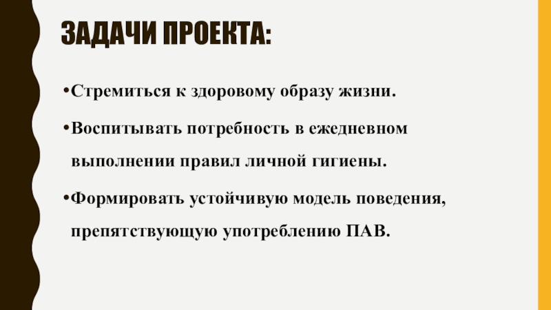 Задачи проекта:Стремиться к здоровому образу жизни.Воспитывать потребность в ежедневном выполнении правил личной гигиены.Формировать устойчивую модель поведения, препятствующую