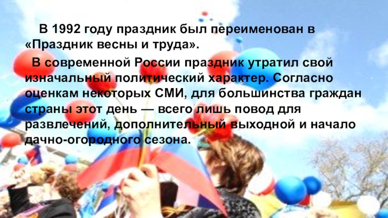 Слайд 7 В 1992 году праздник был переименован в «Праздник весны