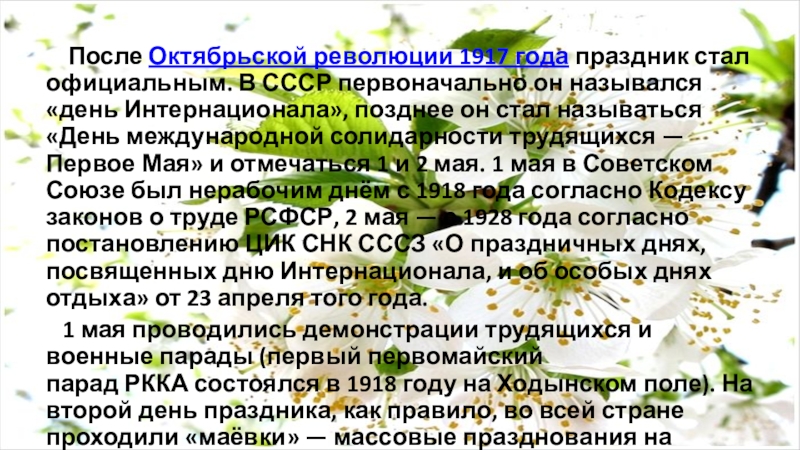Слайд 6 После Октябрьской революции 1917 года праздник стал официальным. В СССР первоначально он назывался