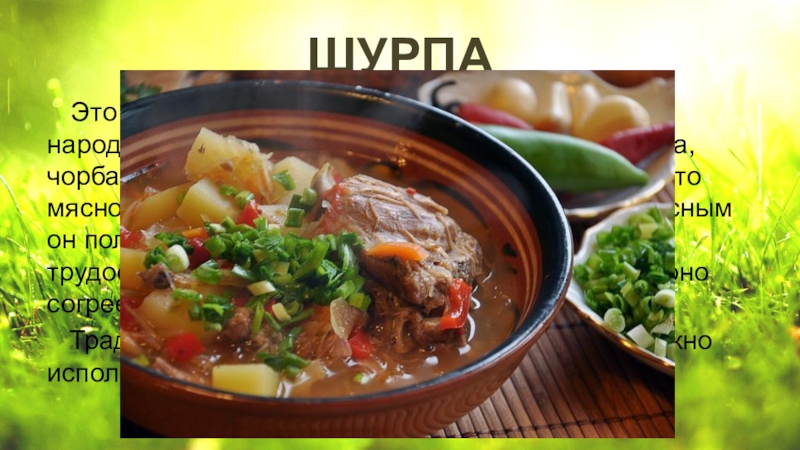 но созвучные названия: шурпа, чорба, шорпо, сорпа и другие. Но, как ни назови, это мясной наваристый суп с овощами. Особенно вкусным он получается, если варить его на костре. Блюдо трудоёмкое, но, если вы целый день на природе, оно согреет и зарядит энергией.