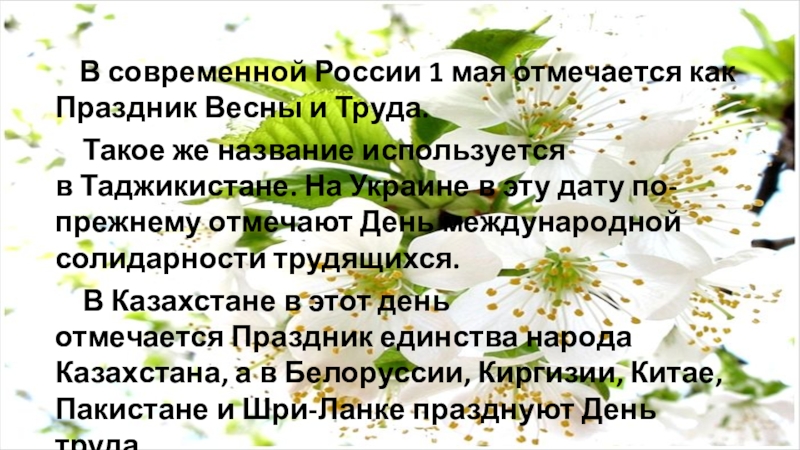Слайд 3 В современной России 1 мая отмечается как Праздник Весны и Труда.