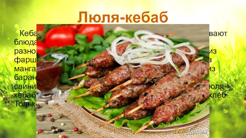 из жареного мяса. Существует множество разновидностей этого кушанья. Люля — это кебаб из фарша, нанизанного на шампуры и обжаренного на мангале. По классическому рецепту люля готовят из баранины, но можно использовать и говядину, и свинину, и даже курицу. Особенность фарша для люля-кебаба в том, что в него не добавляются яйца или хлеб. Только мясо, лук и специи.