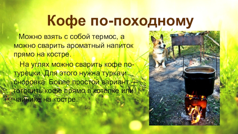 На углях можно сварить кофе по-турецки. Для этого нужна турка и сноровка. Более простой вариант — готовить кофе прямо в котелке или чайнике на костре.