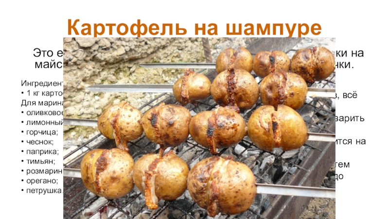 Отправьте картошку в маринад на 1–2 часа. Затем насадите на шампуры и обжаривайте на углях до образования корочки.