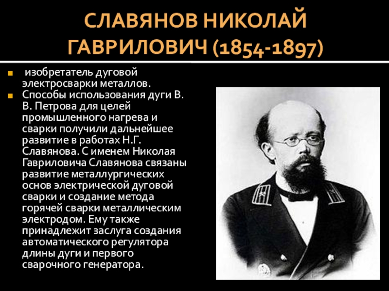 для целей промышленного нагрева и сварки получили дальнейшее развитие в работах Н.Г. Славянова. С именем Николая Гавриловича Славянова связаны развитие металлургических основ электрической дуговой сварки и создание метода горячей сварки металлическим электродом. Ему также принадлежит заслуга создания автоматического регулятора длины дуги и первого сварочного генератора.