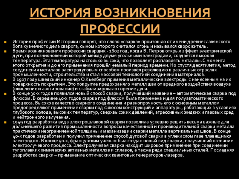 Время возникновения профессии сварщик - 1802 год, когда В. Петров открыл эффект электрической дуги, при возникновении которой между двумя угольными электродами, создаётся высокая температура. Эта температура настолько высока, что позволяет расплавлять металлы. С момента этого открытия и до его применения прошёл немалый период времени. Но спустя десятилетия, метод соединения металлов электродуговым способом произвёл революцию в различных отраслях промышленности, строительства и стал массовой технологией соединения материалов.