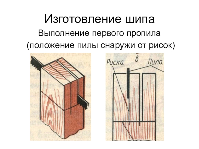 Изготовление шипаВыполнение первого пропила (положение пилы снаружи от рисок)