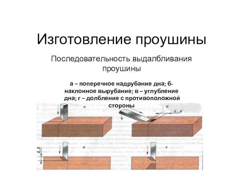 Изготовление проушиныПоследовательность выдалбливания проушиныа – поперечное надрубание дна; б- наклонное вырубание; в – углубление дна; г –