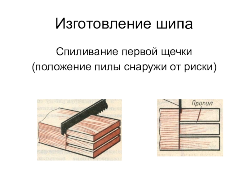 Изготовление шипаСпиливание первой щечки (положение пилы снаружи от риски)