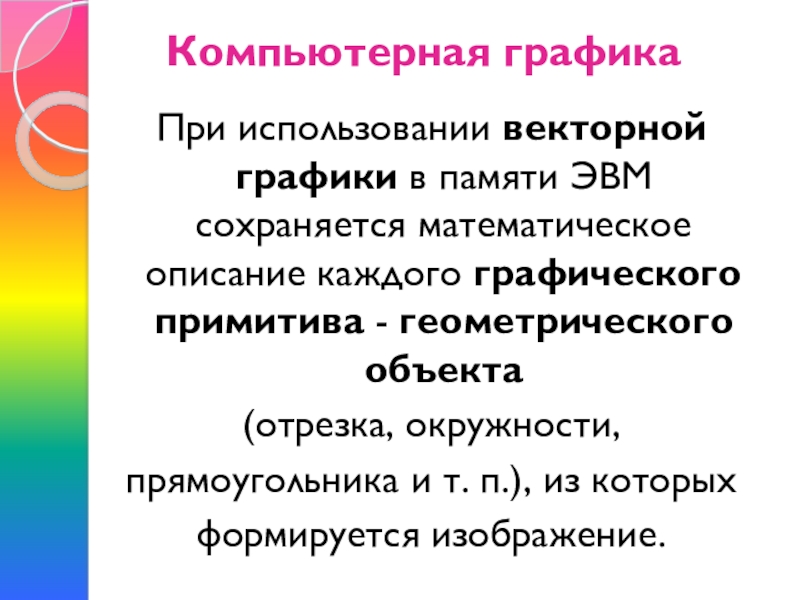 При использовании векторной графики в памяти ЭВМ сохраняется математическое описание каждого графического примитива - геометрического объекта