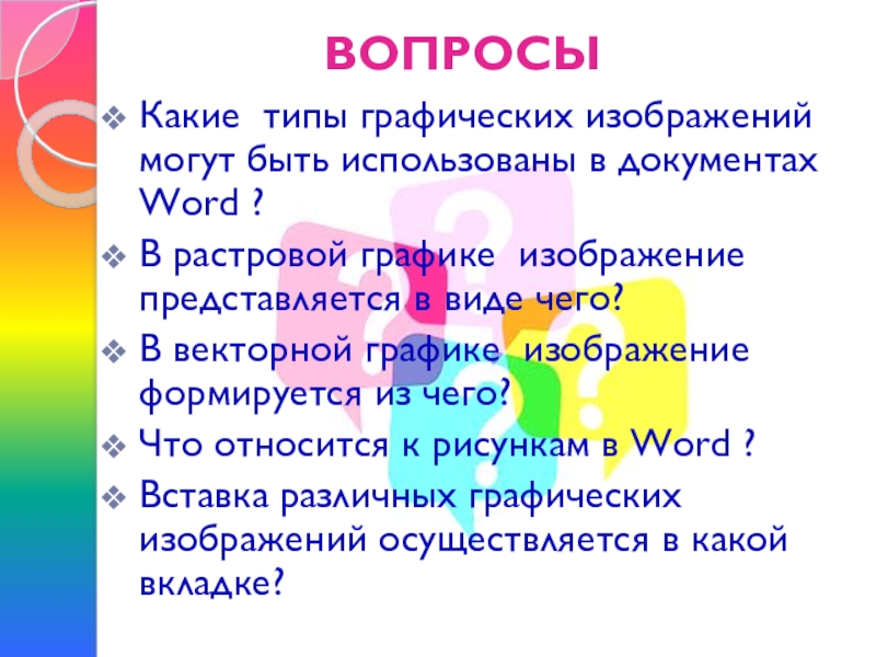 В документ Word можно вставить следующие типы графики (рисунок, клип, графические объекты, рисунок