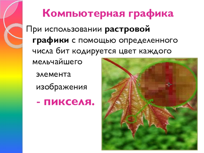 При использовании растровой графики с помощью определенного числа бит кодируется цвет каждого мельчайшего