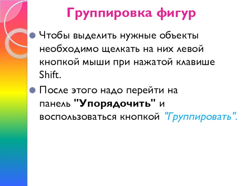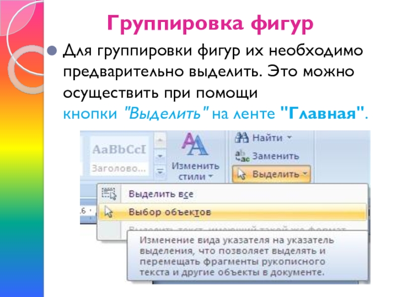 Для группировки фигур их необходимо предварительно выделить. Это можно