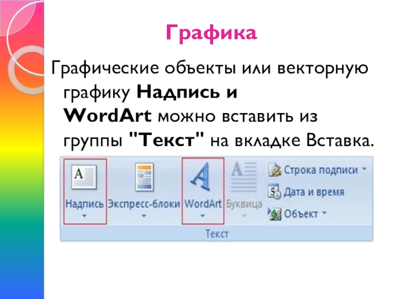 Графические объекты или векторную графику Надпись и WordArt можно вставить из группы "Текст"