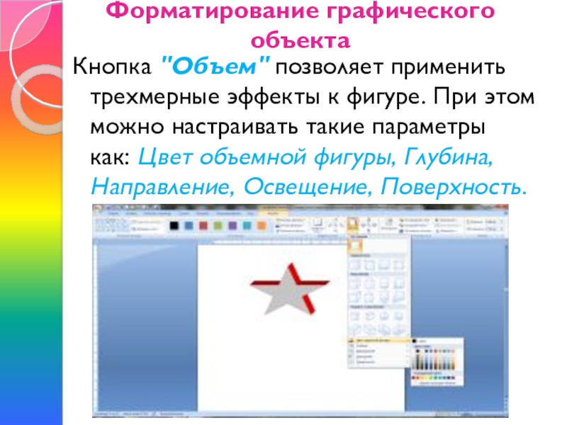 можно настраивать такие параметры как: Цвет объемной фигуры, Глубина, Направление, Освещение, Поверхность.