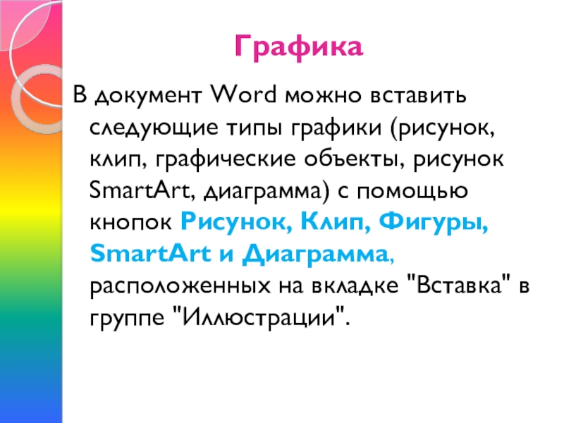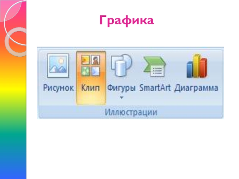 SmartArt, диаграмма) с помощью кнопок Рисунок, Клип, Фигуры, SmartArt и Диаграмма, расположенных на вкладке "Вставка" в группе "Иллюстрации".