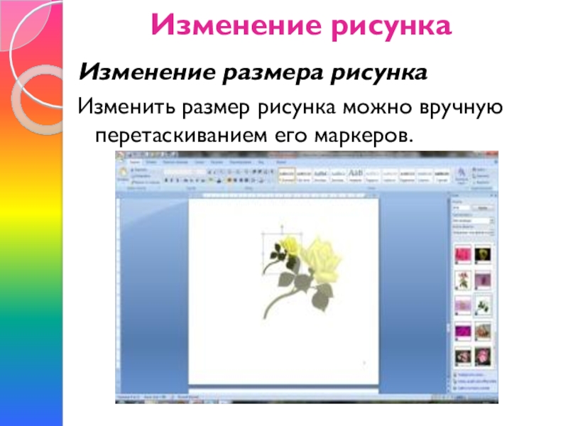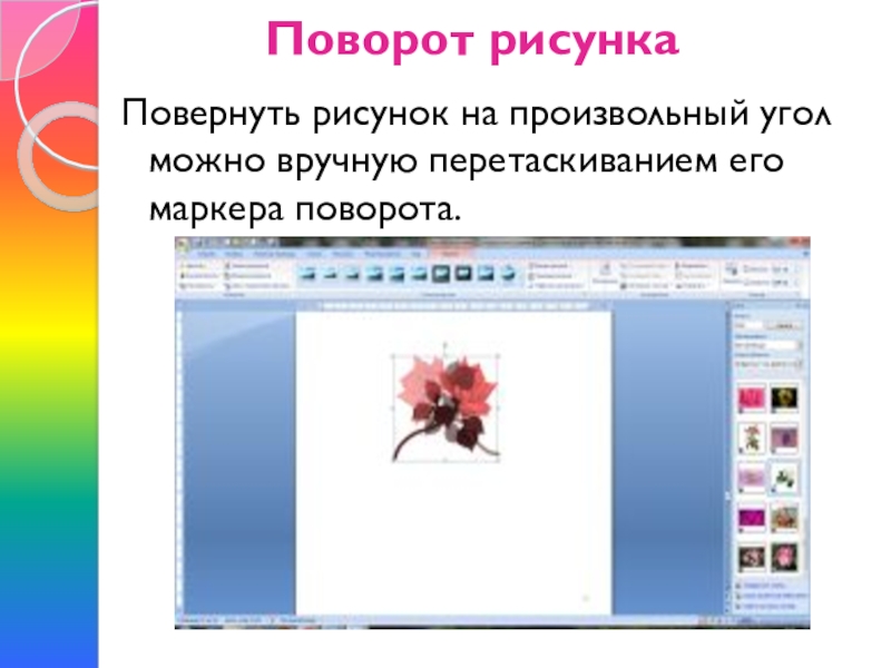 Повернуть рисунок на произвольный угол можно вручную перетаскиванием его