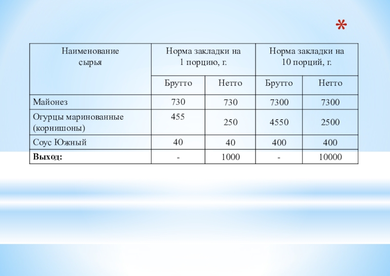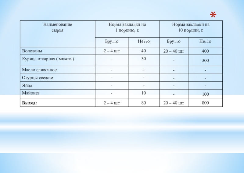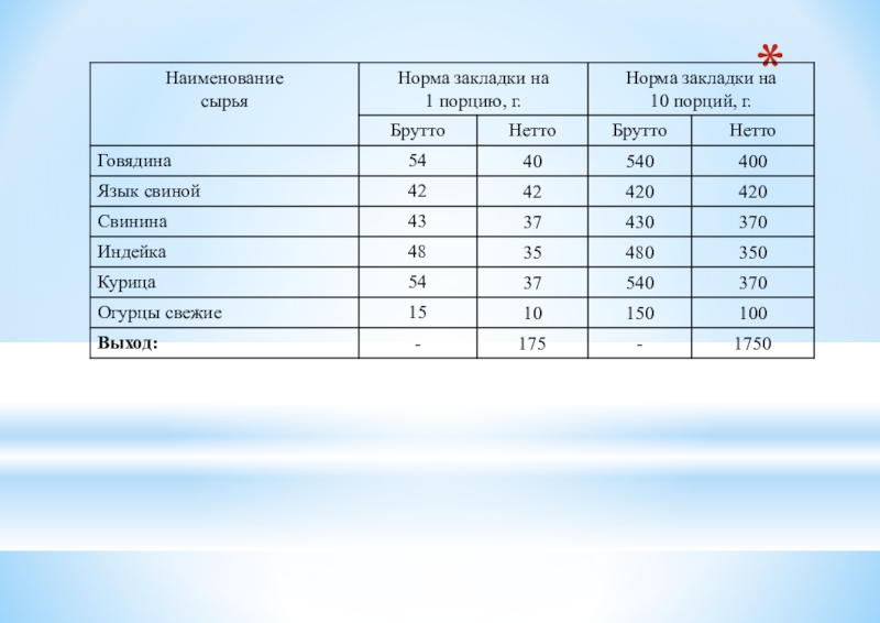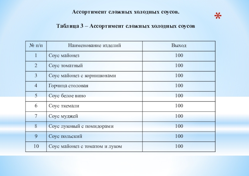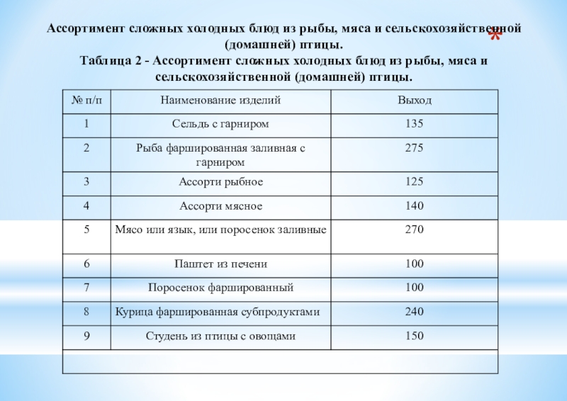 Таблица 2 - Ассортимент сложных холодных блюд из рыбы, мяса и сельскохозяйственной (домашней) птицы.