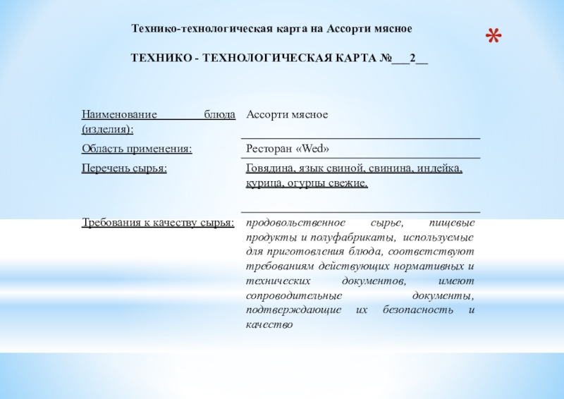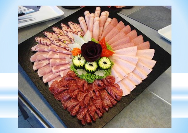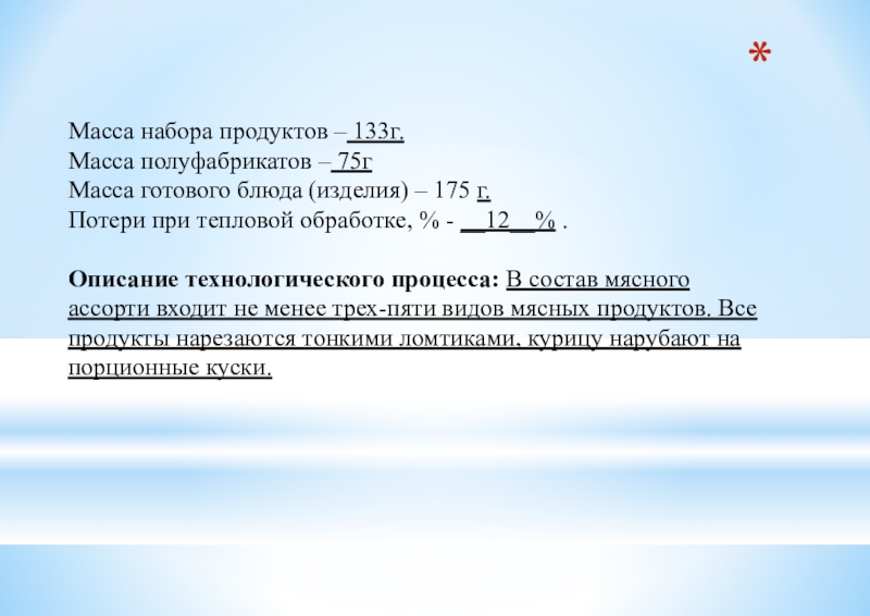 Описание технологического процесса: В состав мясного ассорти входит не менее трех-пяти видов мясных продуктов. Все продукты нарезаются тонкими ломтиками, курицу нарубают на порционные куски.