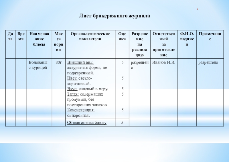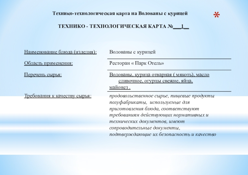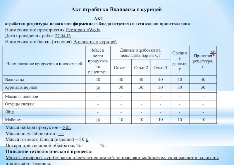 Наименование предприятия Ресторан «Wed» Дата проведения работ 27.04.16__________________ Наименование блюда (изделия) Волованы с курицей