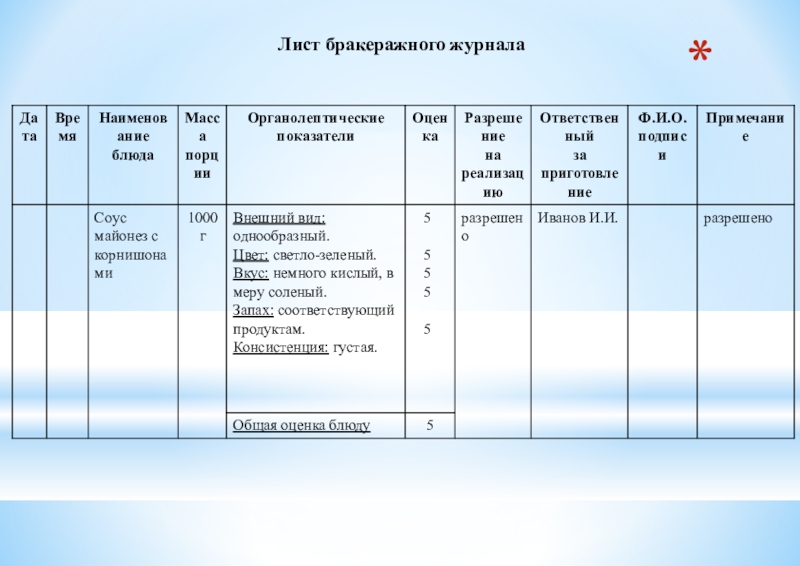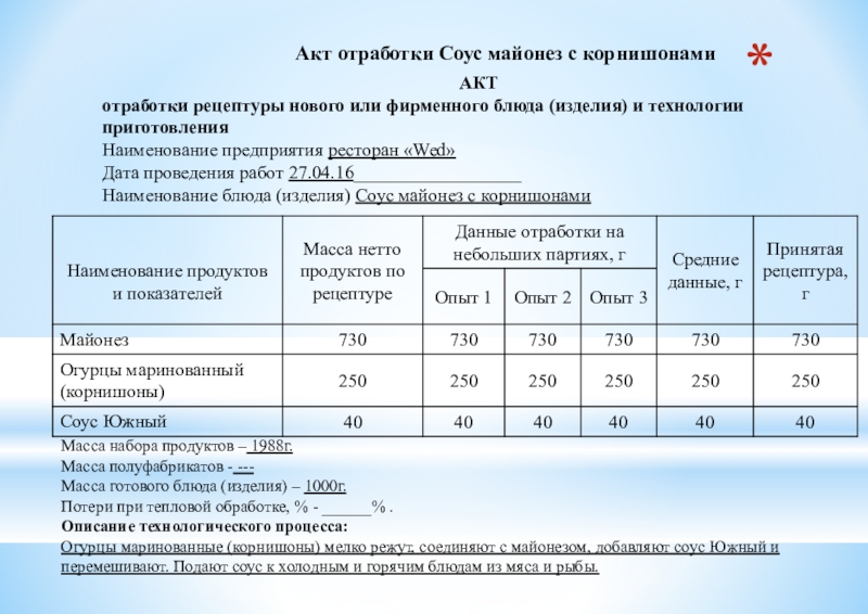 Наименование предприятия ресторан «Wed» Дата проведения работ 27.04.16__________________ Наименование блюда (изделия) Соус майонез с корнишонами