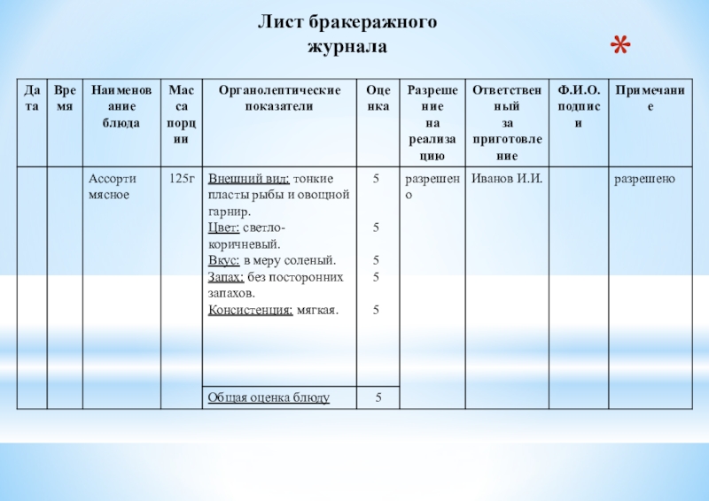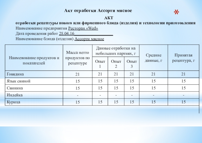 Наименование предприятия Ресторан «Wed» Дата проведения работ 28.04.16__________________ Наименование блюда (изделия) Ассорти мясное