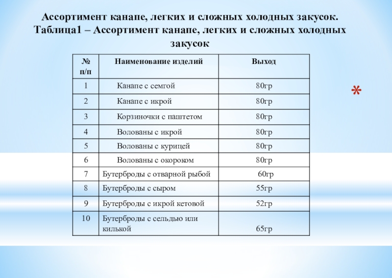 Таблица1 – Ассортимент канапе, легких и сложных холодных закусок