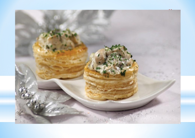 Мякоть отварных кур без кожи нарезают соломкой, заправляют майонезом, укладывают в волованы и посыпают зеленью.