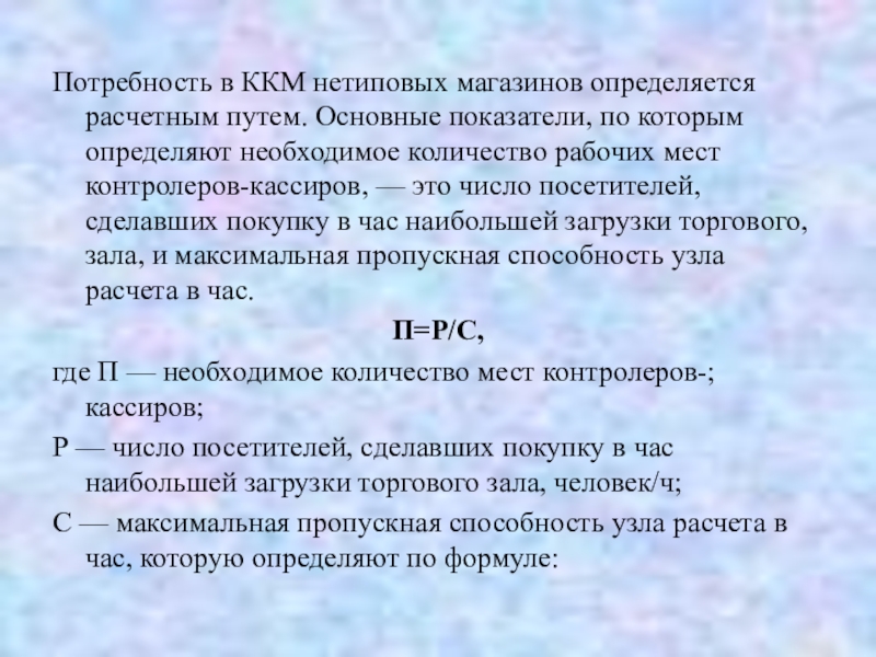 Потребность в ККМ нетиповых магазинов определяется расчетным путем. Основные показатели,