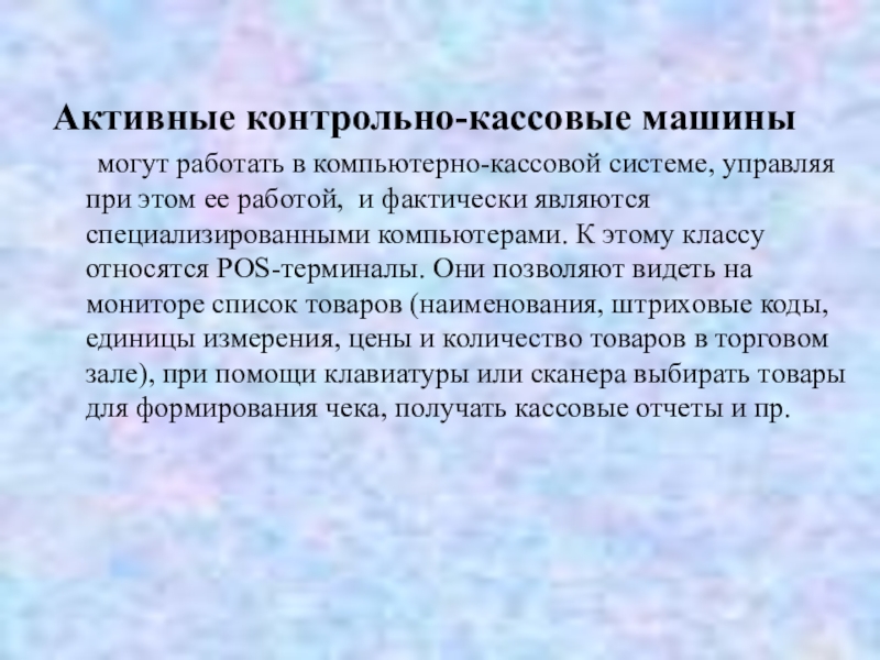 этом ее работой, и фактически являются специализированными компьютерами. К этому классу относятся РОS-терминалы. Они позволяют видеть на мониторе список товаров (наименования, штриховые коды, единицы измерения, цены и количество товаров в торговом зале), при помощи клавиатуры или сканера выбирать товары для формирования чека, получать кассовые отчеты и пр.