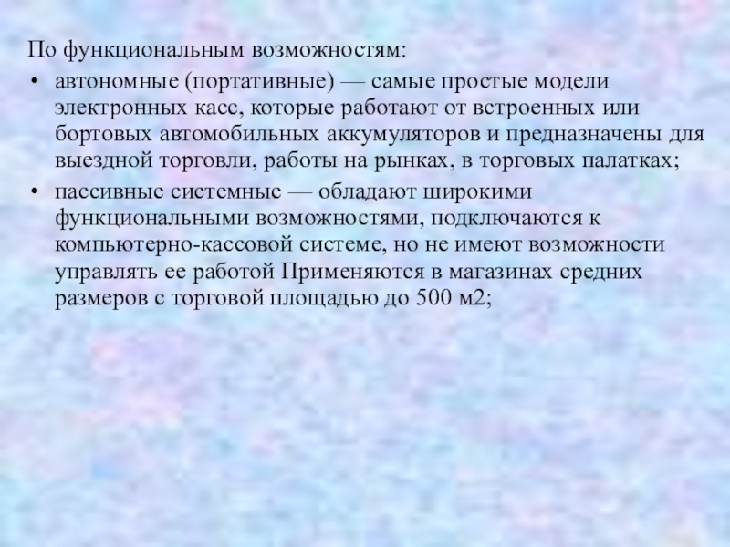 пассивные системные — обладают широкими функциональными возможностями, подключаются к компьютерно-кассовой системе, но не имеют возможности управлять ее работой Применяются в магазинах средних размеров с торговой площадью до 500 м2;