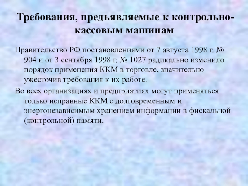 г. № 904 и от 3 сентября 1998 г. № 1027 радикально изменило порядок применения ККМ в торговле, значительно ужесточив требования к их работе.