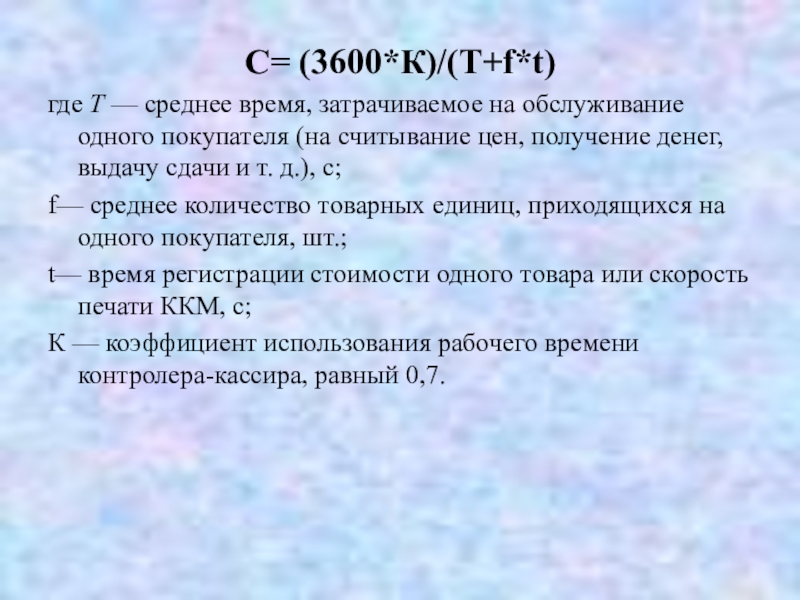 t— время регистрации стоимости одного товара или скорость печати ККМ, с;