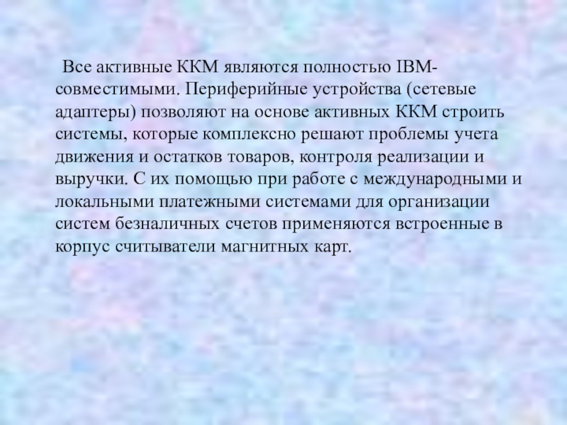 позволяют на основе активных ККМ строить системы, которые комплексно решают проблемы учета движения и остатков товаров, контроля реализации и выручки. С их помощью при работе с международными и локальными платежными системами для организации систем безналичных счетов применяются встроенные в корпус считыватели магнитных карт.