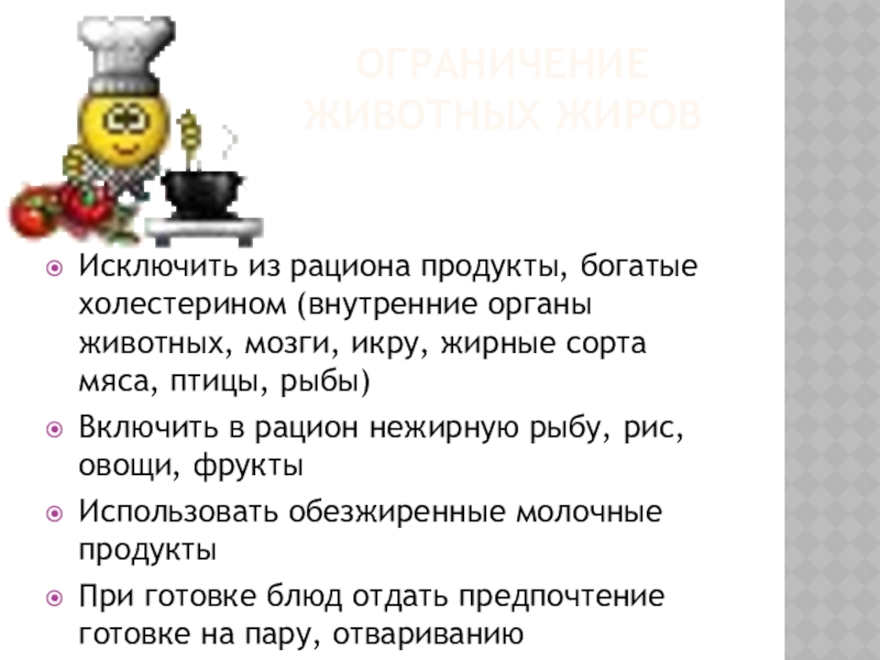 Исключить из рациона продукты, богатые холестерином (внутренние органы животных,