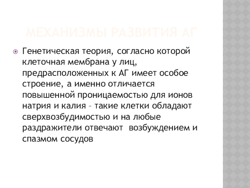 к АГ имеет особое строение, а именно отличается повышенной проницаемостью для ионов натрия и калия – такие клетки обладают сверхвозбудимостью и на любые раздражители отвечают возбуждением и спазмом сосудов