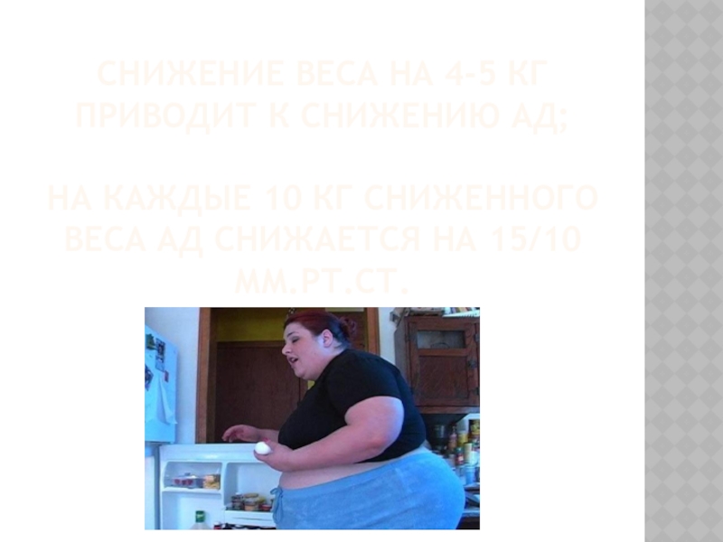 Слайд 20СНИЖЕНИЕ ВЕСА НА 4-5 КГ ПРИВОДИТ К СНИЖЕНИЮ АД;