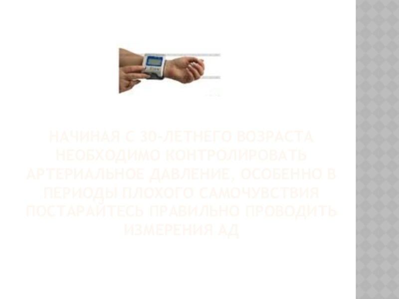 Слайд 12НАЧИНАЯ С 30-ЛЕТНЕГО ВОЗРАСТА НЕОБХОДИМО КОНТРОЛИРОВАТЬ АРТЕРИАЛЬНОЕ ДАВЛЕНИЕ, ОСОБЕННО В ПЕРИОДЫ