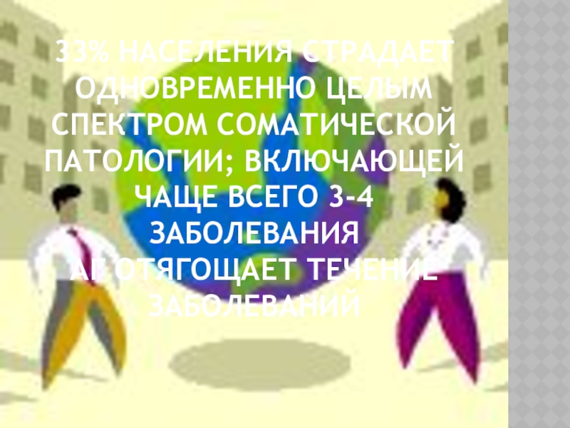 Слайд 433% НАСЕЛЕНИЯ СТРАДАЕТ ОДНОВРЕМЕННО ЦЕЛЫМ СПЕКТРОМ СОМАТИЧЕСКОЙ ПАТОЛОГИИ; ВКЛЮЧАЮЩЕЙ ЧАЩЕ ВСЕГО