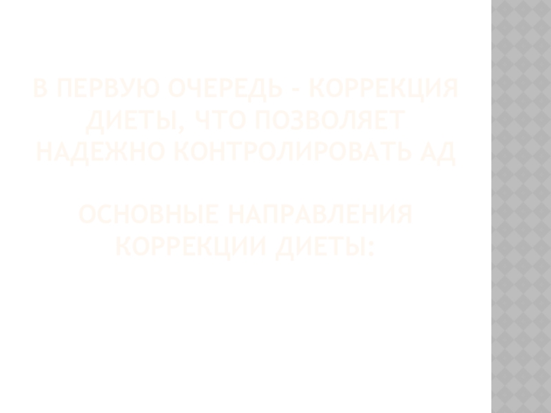 В ПЕРВУЮ ОЧЕРЕДЬ - КОРРЕКЦИЯ ДИЕТЫ, ЧТО ПОЗВОЛЯЕТ НАДЕЖНО КОНТРОЛИРОВАТЬ АД
