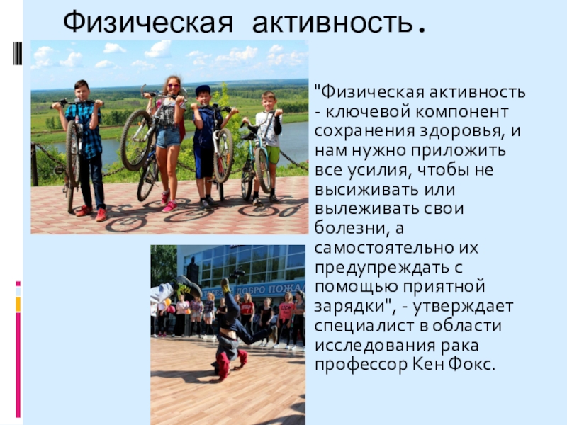 приложить все усилия, чтобы не высиживать или вылеживать свои болезни, а самостоятельно их предупреждать с помощью приятной зарядки", - утверждает специалист в области исследования рака профессор Кен Фокс.