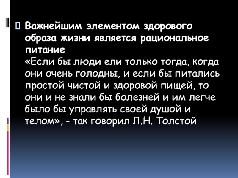 только тогда, когда они очень голодны, и если бы питались простой чистой и здоровой пищей, то они и не знали бы болезней и им легче было бы управлять своей душой и телом», - так говорил Л.Н. Толстой