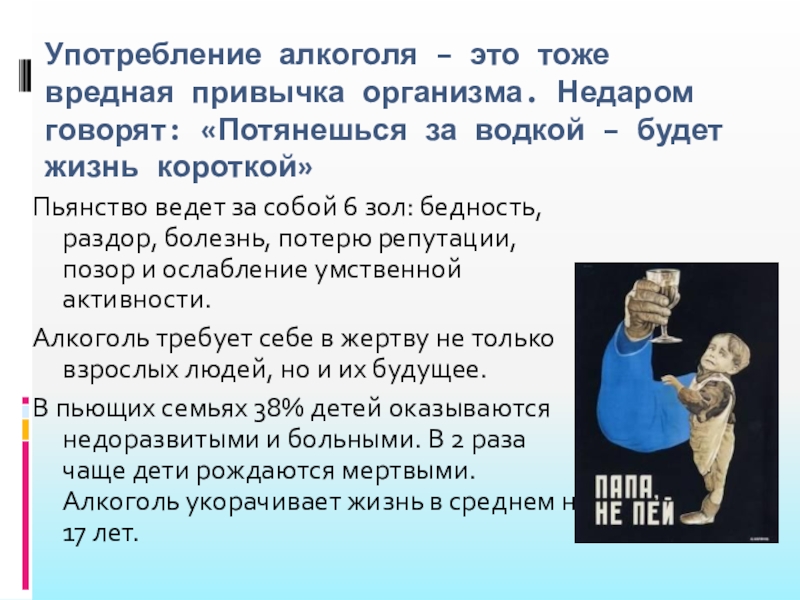 Слайд 18Употребление алкоголя – это тоже вредная привычка организма. Недаром говорят: «Потянешься