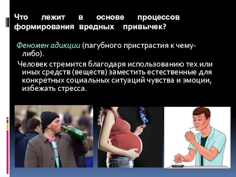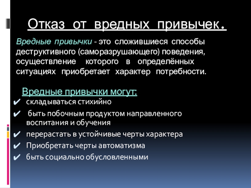 Вредные привычки - это сложившиеся способы деструктивного (саморазрушающего) поведения, осуществление которого в определённых ситуациях приобретает характер потребности.