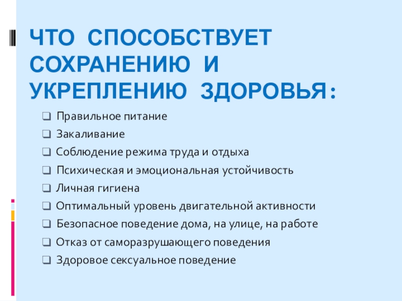 Слайд 3Что способствует сохранению и укреплению здоровья: