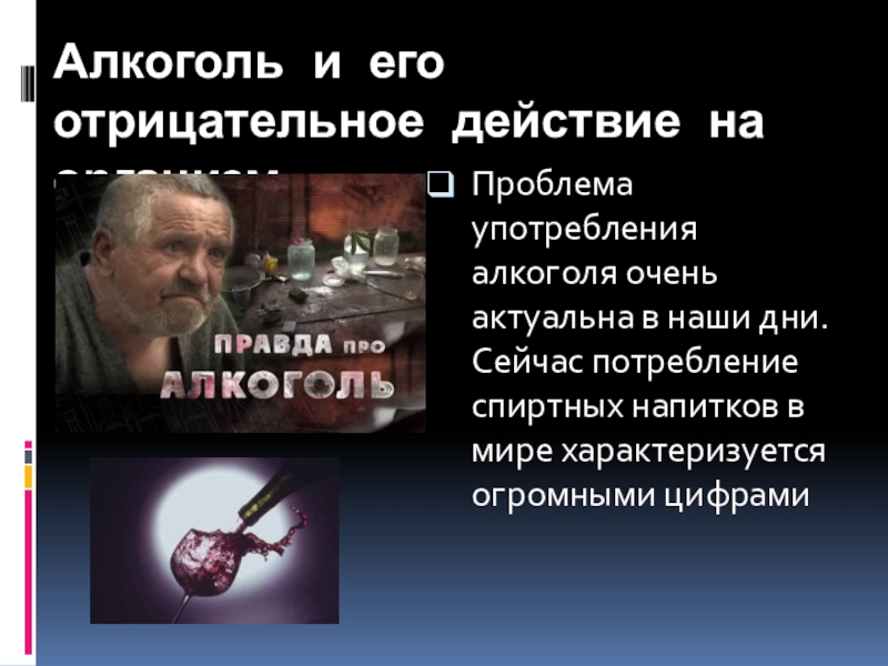 Слайд 19Алкоголь и его отрицательное действие на организм.