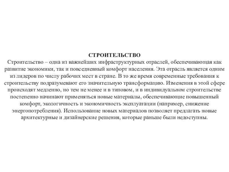 так и повседневный комфорт населения. Эта отрасль является одним из лидеров по числу рабочих мест в стране. В то же время современные требования к строительству подразумевают его значительную трансформацию. Изменения в этой сфере происходят медленно, но тем не менее и в типовом, и в индивидуальном строительстве постепенно начинают применяться новые материалы, обеспечивающие повышенный комфорт, экологичность и экономичность эксплуатации (например, снижение энергопотребления). Использование новых материалов позволяет предлагать новые архитектурные и дизайнерские решения, которые раньше были недоступны.