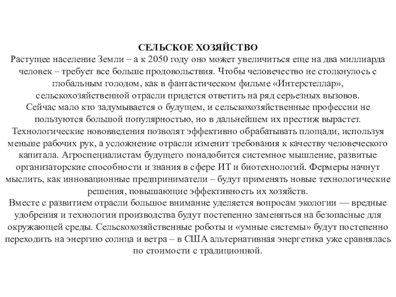 Сейчас мало кто задумывается о будущем, и сельскохозяйственные профессии не пользуются большой популярностью, но в дальнейшем их престиж вырастет. Технологические нововведения позволят эффективно обрабатывать площади, используя меньше рабочих рук, а усложнение отрасли изменит требования к качеству человеческого капитала. Агроспециалистам будущего понадобится системное мышление, развитые организаторские способности и знания в сфере ИТ и биотехнологий. Фермеры начнут мыслить, как инновационные предприниматели – будут применять новые технологические решения, повышающие эффективность их хозяйств.