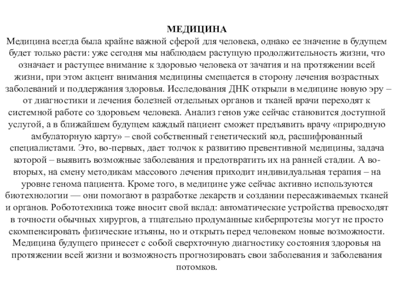 в будущем будет только расти: уже сегодня мы наблюдаем растущую продолжительность жизни, что означает и растущее внимание к здоровью человека от зачатия и на протяжении всей жизни, при этом акцент внимания медицины смещается в сторону лечения возрастных заболеваний и поддержания здоровья. Исследования ДНК открыли в медицине новую эру – от диагностики и лечения болезней отдельных органов и тканей врачи переходят к системной работе со здоровьем человека. Анализ генов уже сейчас становится доступной услугой, а в ближайшем будущем каждый пациент сможет предъявить врачу «природную амбулаторную карту» – свой собственный генетический код, расшифрованный специалистами. Это, во-первых, дает толчок к развитию превентивной медицины, задача которой – выявить возможные заболевания и предотвратить их на ранней стадии. А во-вторых, на смену методикам массового лечения приходит индивидуальная терапия – на уровне генома пациента. Кроме того, в медицине уже сейчас активно используются биотехнологии — они помогают в разработке лекарств и создании пересаживаемых тканей и органов. Робототехника тоже вносит свой вклад: автоматические устройства превосходят в точности обычных хирургов, а тщательно продуманные киберпротезы могут не просто скомпенсировать физические изъяны, но и открыть перед человеком новые возможности. Медицина будущего принесет с собой сверхточную диагностику состояния здоровья на протяжении всей жизни и возможность прогнозировать свои заболевания и заболевания потомков.