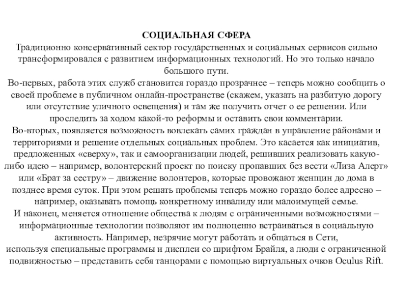 И наконец, меняется отношение общества к людям с ограниченными возможностями – информационные технологии позволяют им полноценно встраиваться в социальную активность. Например, незрячие могут работать и общаться в Сети,